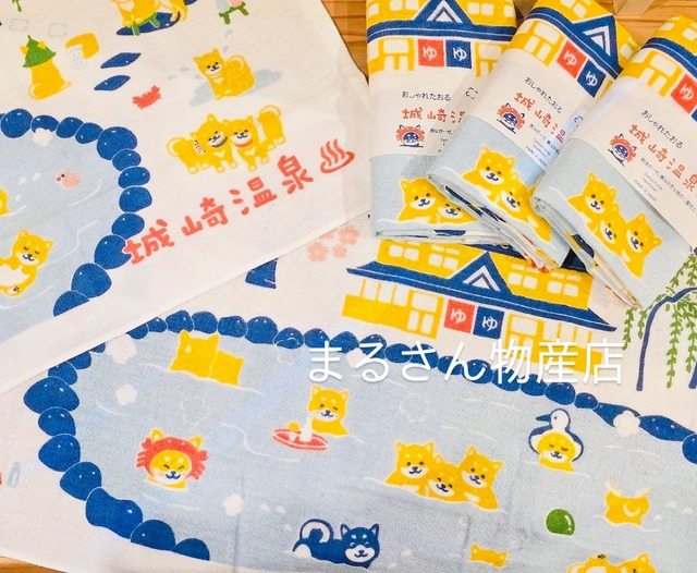 城崎温泉豆柴おしゃれタオル 日本製コットン100% フェイスタオル 「まるさん物産店✖️河本商店」 限定のオリジナルデザインたおる。 生地も抜群! デザインもかわいい!